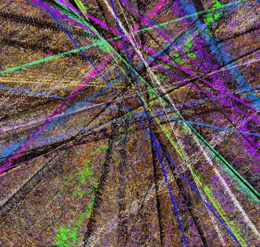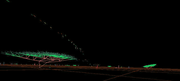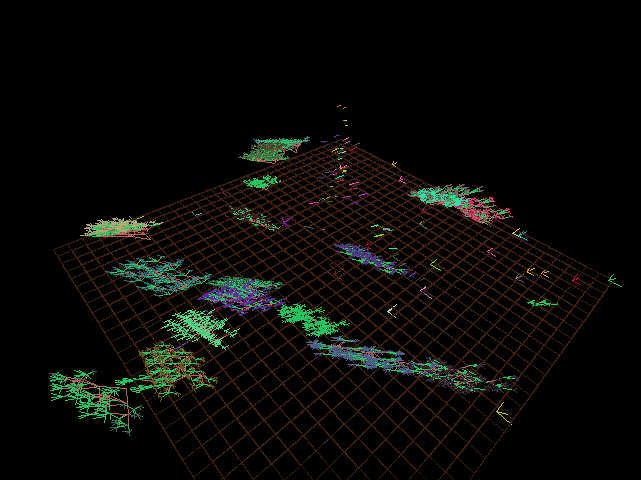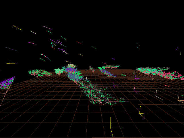 According to Lovell, " EIDEA exists in cyberspace as a mathematical plane floating in a vast space. Three artificial entities exist on this plane; birds, wolves, and trees, and interact to form a closed ecosystem." Trees in this world grow, reach maturity in ten years (y-units), bear fruit and live to an expected 100 years. Birds in this world eat the fruit of the trees, behave in a flocking fashion, breed and create offspring that then join the flock. The predator in this world, a wolf-like creature called a turoid (after computer scientist Allen Turing), feeds on the birds and has its own breeding and life cycle. Lovell explains, "Trees are formed by an L-system, creating a fractal shape. Trees grow slowly, some 100 times slower than the other creatures, and over time bear fruit for the birds and wolves to eat."