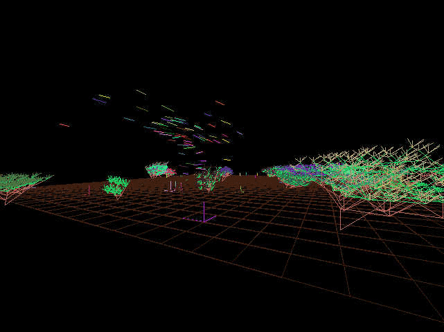 The animals' behavior or movement is modeled to give them unique characteristics. "Animal motions are determined through two types of algorithms; one for bird motions, and one for wolf motion" says Lovell. "Birds behave according to a flocking algorithm [3]. Each bird is bred to avoid predators (wolves), stay within the boundaries of the world, and fly close to the center of the group of birds immediately closest to it."
